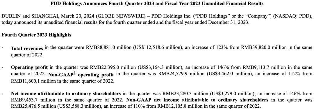 到了今年3月,拼多多发布2023年第四季度及全年业绩报告,数据展现出强劲的增长势头。报告显示,在第四季度中,拼多多集团营收为889亿元,同比增长123%。纵观2023年全年,拼多多实现营收2476亿元,净利润600亿元,营收和净利润双双同比增长90%。