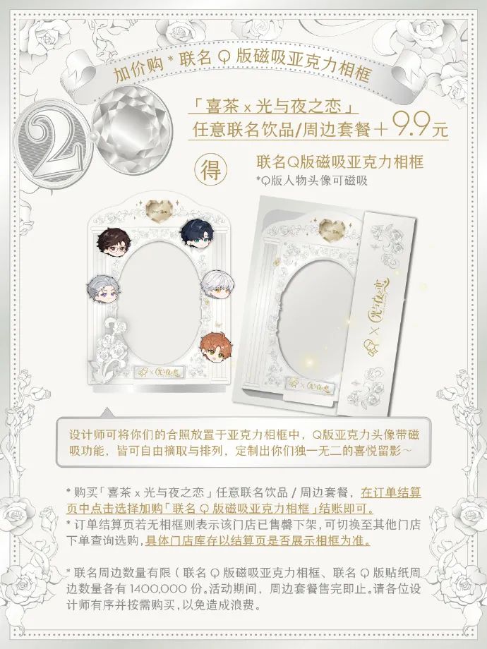 唯一的变动在于新出了一个“联名相框套餐”,购买两杯联名饮品即可获赠一套《光夜》磁吸亚克力相框,售价36元,值得一提的是,这个套餐中并无《光夜》贴纸。