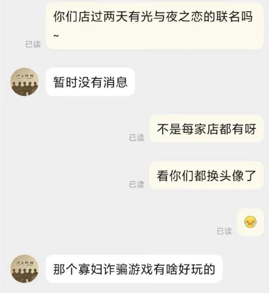 沪上阿姨门店客服吐槽《光与夜之恋》是“寡妇诈骗游戏”,还声称要“掐死陆沉(《光夜》的男主角之一)”,对玩家的态度也非常差,最终这次联名活动被叫停了。