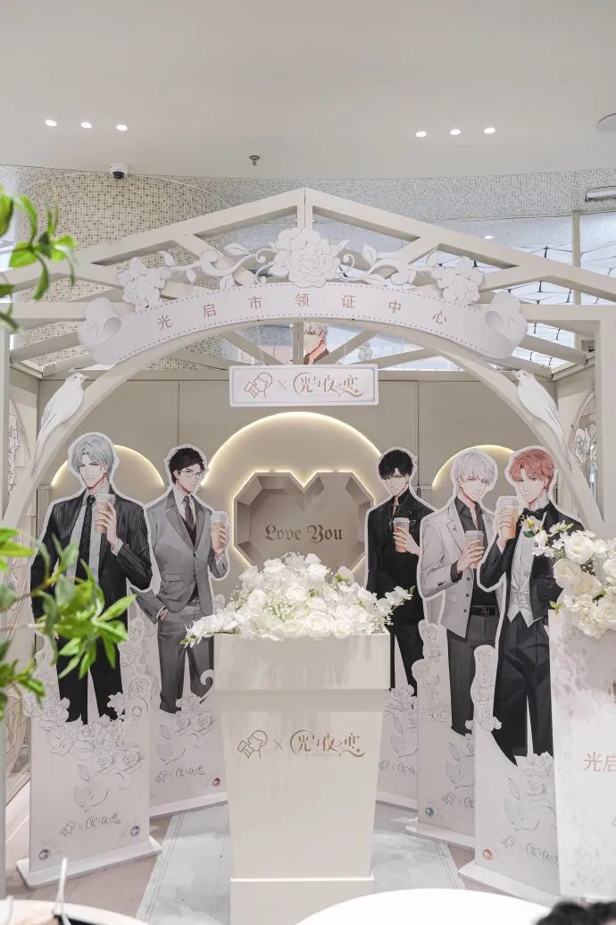 除了赠品周边之外,喜茶还打造了线下主题门店,将门店打造成浪漫的“领证中心”,玩家可以拿着喜证到现场去戳钢印,还可以和男主角立牌合照打卡,真实感满满。