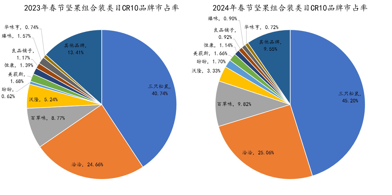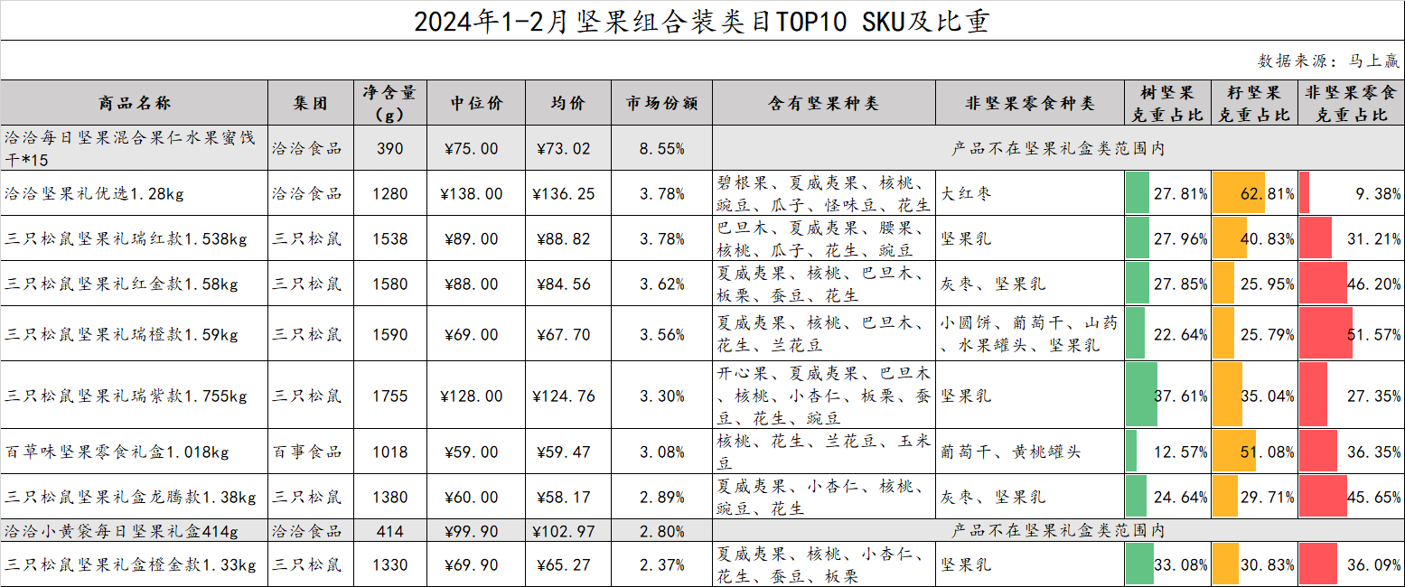 进一步聚焦到类目内春节期间主销的坚果礼盒类产品,我们拉取了2023年1-2月、2024年1-2月两个时间段内坚果组合装类目中的份额TOP 10 SKU进行对比。