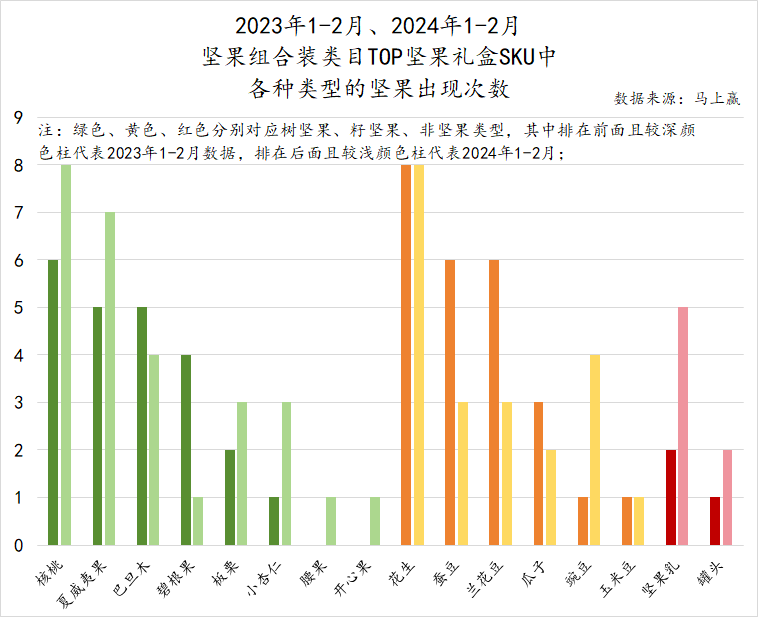 进一步打开坚果礼盒,从内含的产品种类变化去看,我们梳理了2023年、2024年1-2月期间坚果组合装类目TOP坚果礼盒产品中各种类型坚果的出现次数。