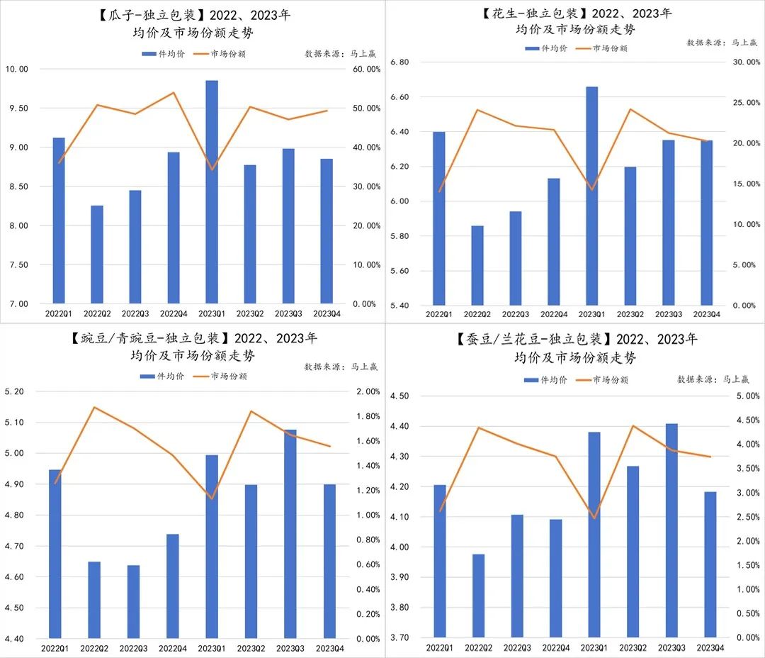当我们将瓜子、花生等四类典型的籽坚果产品的件均价及市场份额走势同样列出时,树坚果与籽坚果的价格差异便一目了然了。