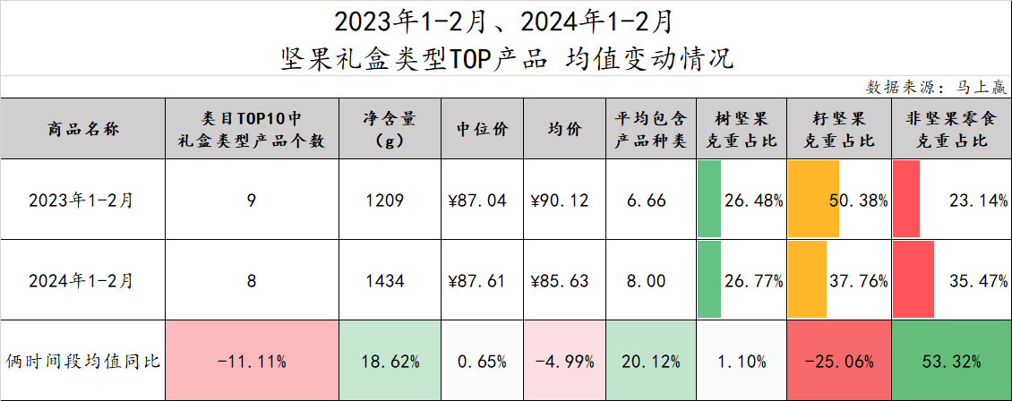 最后,我们对2023年、2024年1-2月两个时间段内,类目内的坚果礼盒TOP产品相关属性的平均情况做了梳理与对比,以观察2023年、2024年两年时间中坚果礼盒类产品发生的变化。