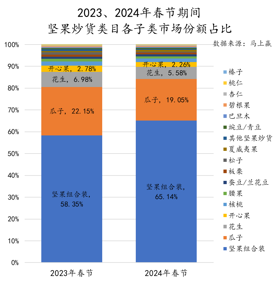 春节过后,马上赢曾对24年春节期间的消费进行过复盘,虽然2024年的春节整体线下零售消费不容乐观,但是坚果炒货类目的表现依然优于大盘整体表现。