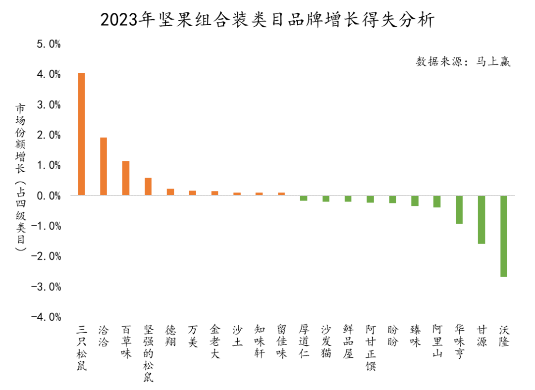 整体上看,坚果炒货类目在2023年份额增速为负。