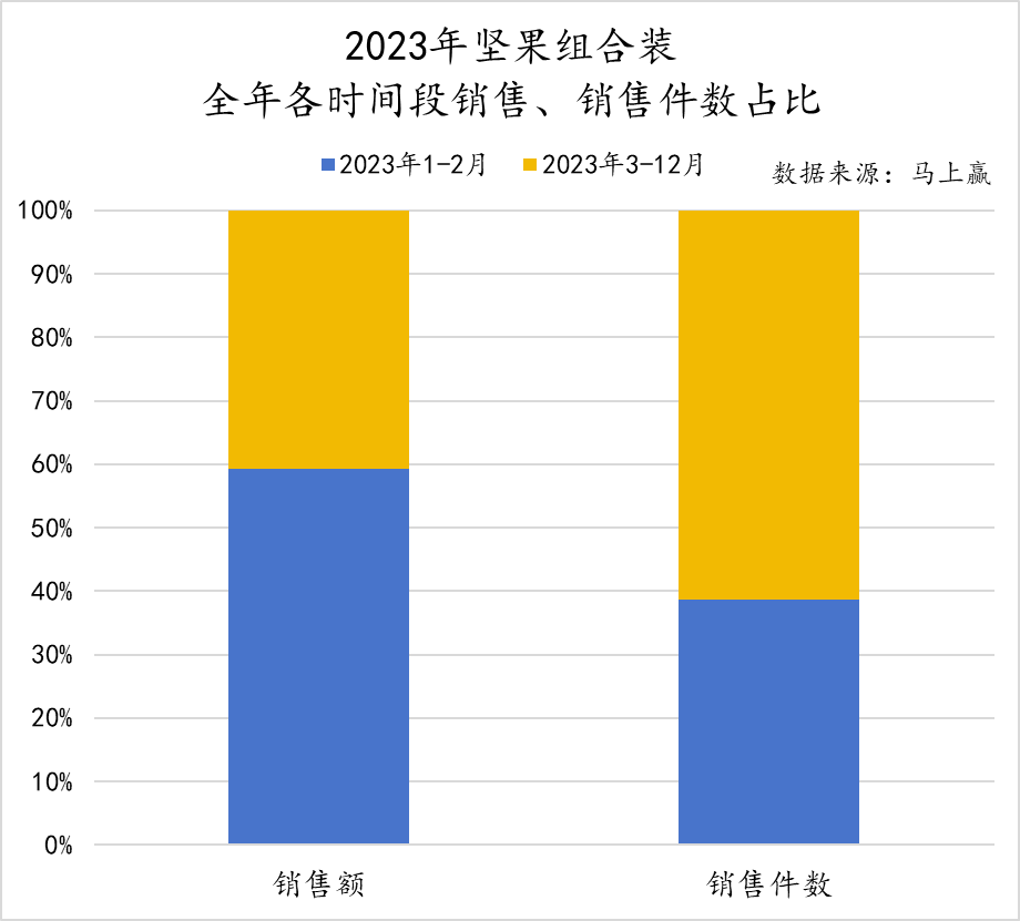对于坚果炒货市场而言,尤其是以礼盒为代表的组合装坚果,春节是十分重要的销售节点。基于马上赢线下零售监测网络中的数据可以看到,对于包括坚果礼盒类产品在内的坚果组合装这一类目而言,每年1-2月的销售额对于其整年的销售占比很大,在2023年1-2月期间的销售额占据了全年销售额的60%左右,销售件数也占据了近40%。