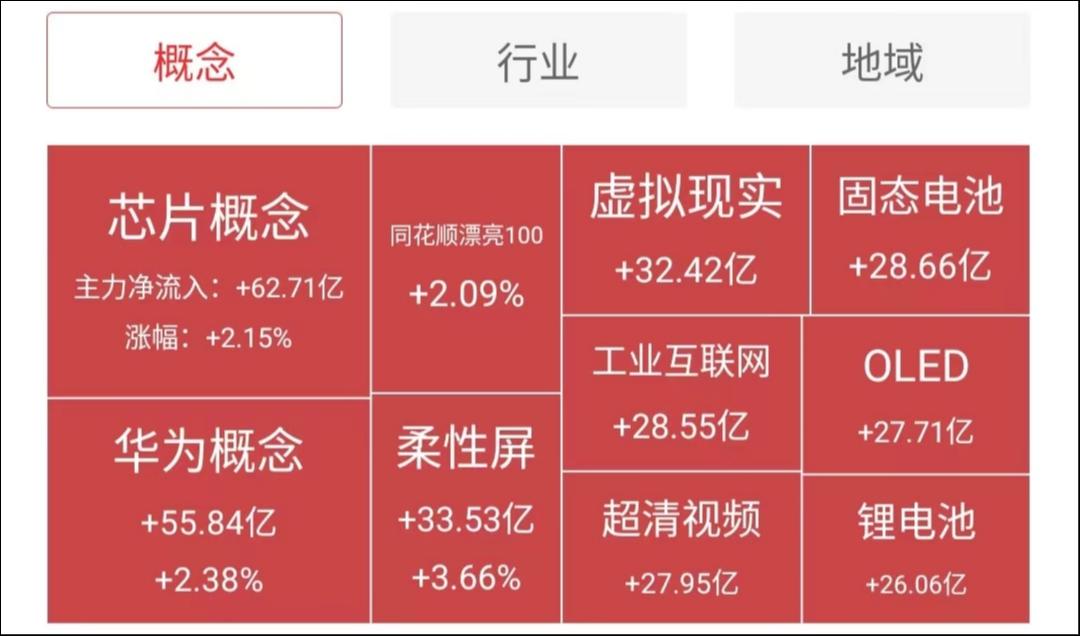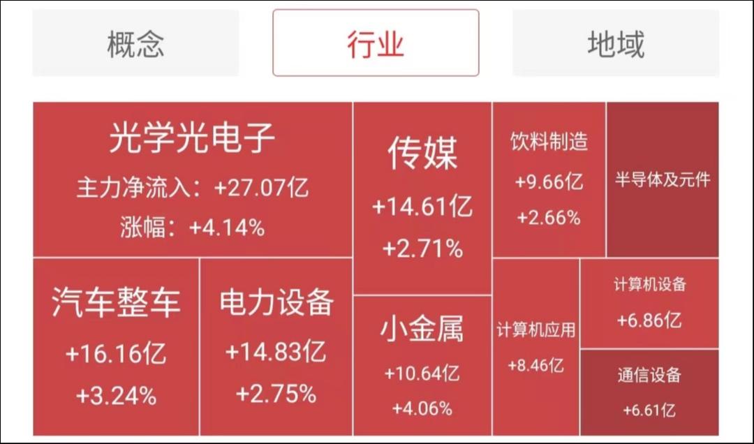 主力资金净流入最多的行业板块是工光学光电子、汽车整车、电力设备、传媒板块,流入最多的概念板块是芯片概念、华为概念、柔性屏、虚拟现实等板块。