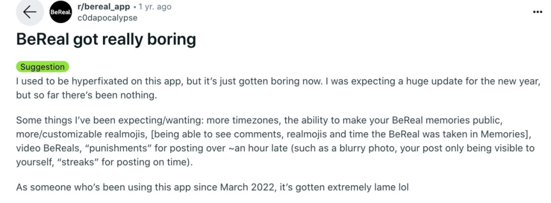 其实早在去年,就有不少数据监测平台注意到 BeReal 日活下降的问题。用户群体以年轻人为主的 App 隐患就是要面对一群“善变”的人,根据 Reddit、X.com 等平台上用户的反馈,BeReal 一年前吸引用户的功能在一年后开始劝退他们了。
