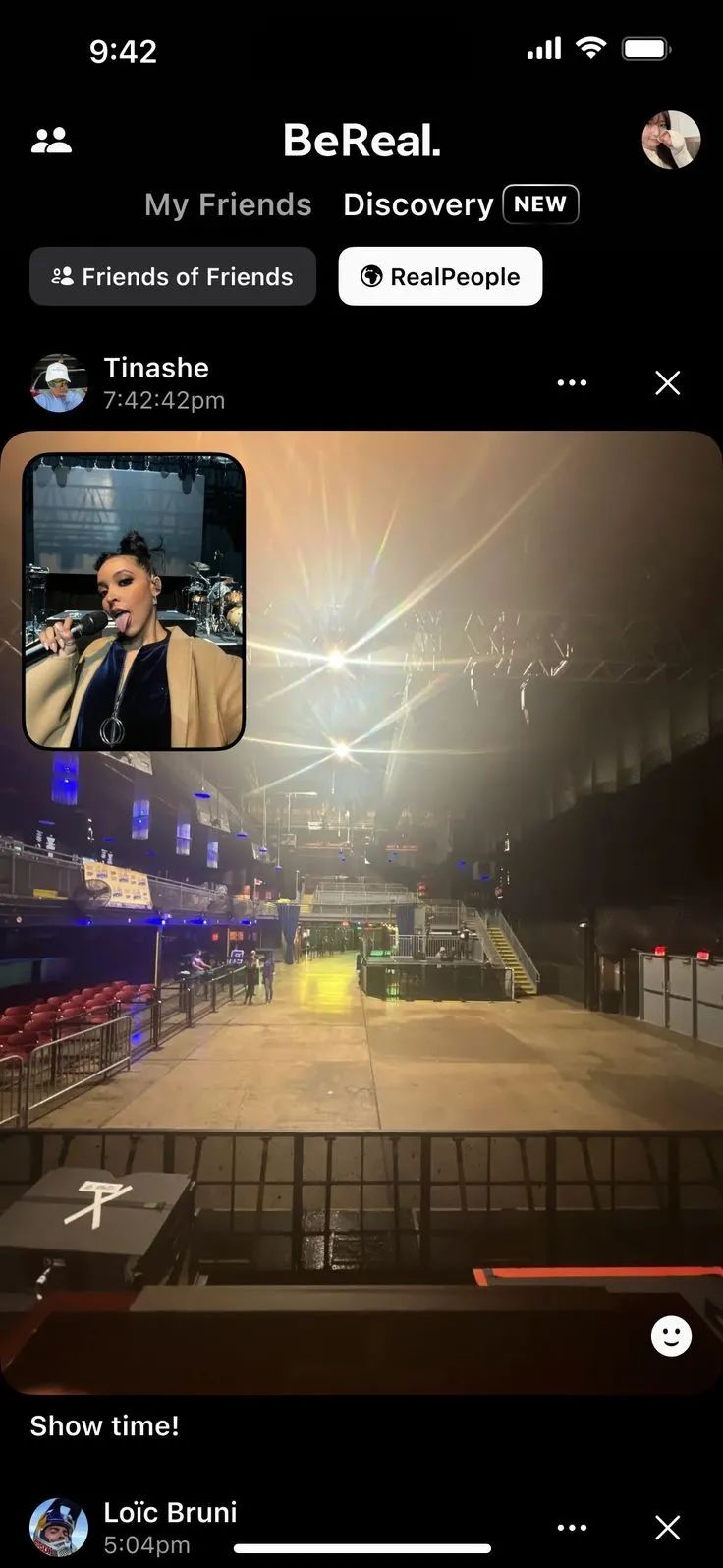 2. 2023 年 5 月,BeReal 在英国市场首先测试 RealPeople 功能,邀请公众人物入驻 App,希望用户在 BeReal 上能看到公众人物更真实的一面。这一功能被放在了当时与 My Friends 并列的 Discovery 菜单下,作为二级菜单。