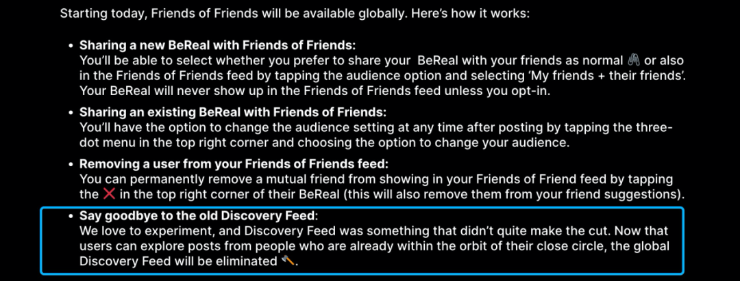 4. 2023 年 8 月,BeReal 用 Friends of Friends 菜单替代了 Discovery 菜单(展示自己不认识的人的动态)。在新闻稿里,BeReal 承认 Discovery 信息流没有跑通,会把这一菜单删掉。