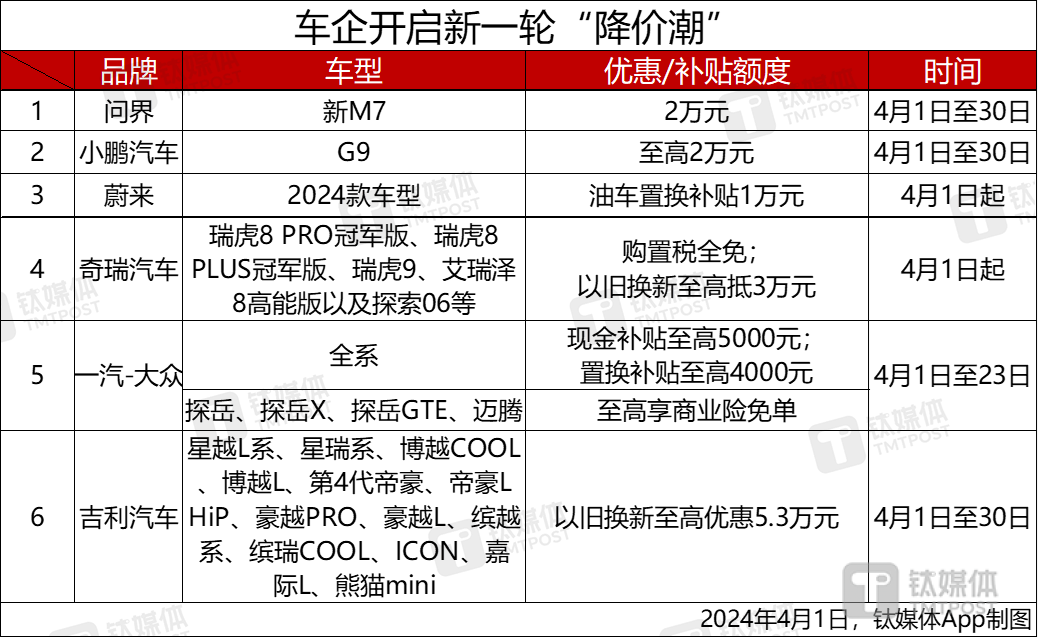 4月1日消息,随着小米汽车携定价21.59万元起的SU7入局,新能源市场新一轮“降价潮”开启,竞争进一步加剧。据钛媒体App不完全统计,4月第一天,问界、蔚来、小鹏等多家车企纷纷推出优惠政策或补贴活动,变相降价。其中,问界新M7直降2万,至22.98万元起;小鹏G9最高补贴2万,至24.39万元起;蔚来2024款车型油车置换补贴1万,吉利汽车部分车型以旧换新最高优惠5.3万元。值得注意的是,就在国内“降价潮”持续时,特斯拉今日则宣布国产Model Y系列涨价5000元。