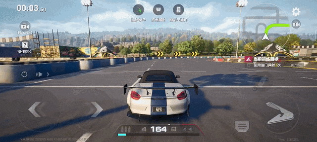首先,除了移动端较为常规的漂移技能操作——长按方向键加点击手刹——《极品飞车:集结》还增加依赖“滑动”手势的加速技能,搭配漂移角度条,为玩家增加更简单的“可视化”的操作和面对不同弯道的灵活选择。