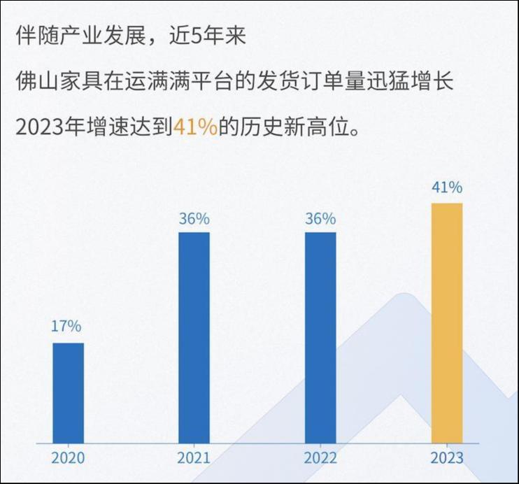 运满满数据显示,近5年来,佛山家具物流的数字化水平提升迅猛。佛山家具2020年平台发货订单量同比增长17%;2021年同比增速翻了一番,飙升至36%;疫情下,2022年不仅没有出现萎缩,甚至实现了2021年超高增速的延续;2023年,平台佛山家具货量实现爆发式增长,增速达到了41%的历史高位。