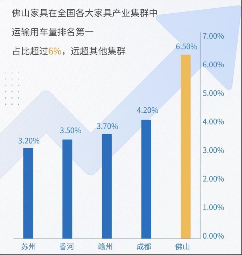 从用车量看,佛山在全国十大家具产业集群运输用车量中排名第一,占比超过6%,远超其他家具产业集群。