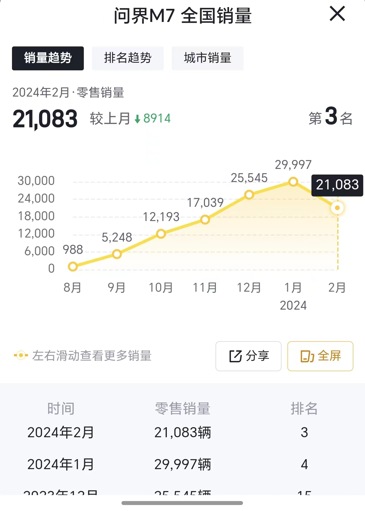 以新能源网红的新问界M7为例,上市后仅靠短短数月完成了逆袭,单车销量匹敌理想汽车,热度居高不下。但热度并非永恒的,从销量上看,新问界M7度过了巅峰期,2月份销量出现了下滑,最新公开的3月份数据中,新M7的交付量为24598辆,仍为中国新势力车型销量第一,但没能回到1月份29997辆的巅峰,生态护城河以及家用舒适的产品定义也无法长久爆发,这恐怕跟市场热度有关。