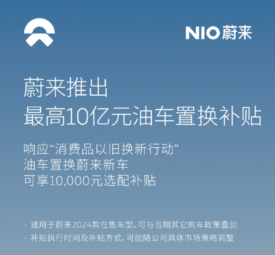 蔚来汽车推出了最高10亿元油车置换补贴,油车用户置换蔚来2024款新车,可以额外获得10000元选装基金补贴,叠加一系列补贴后可以获得最高15000元选装基金、价值3600元的换电券、NOP+全域领航辅助一年使用权,还有一台免费的NIO Phone。