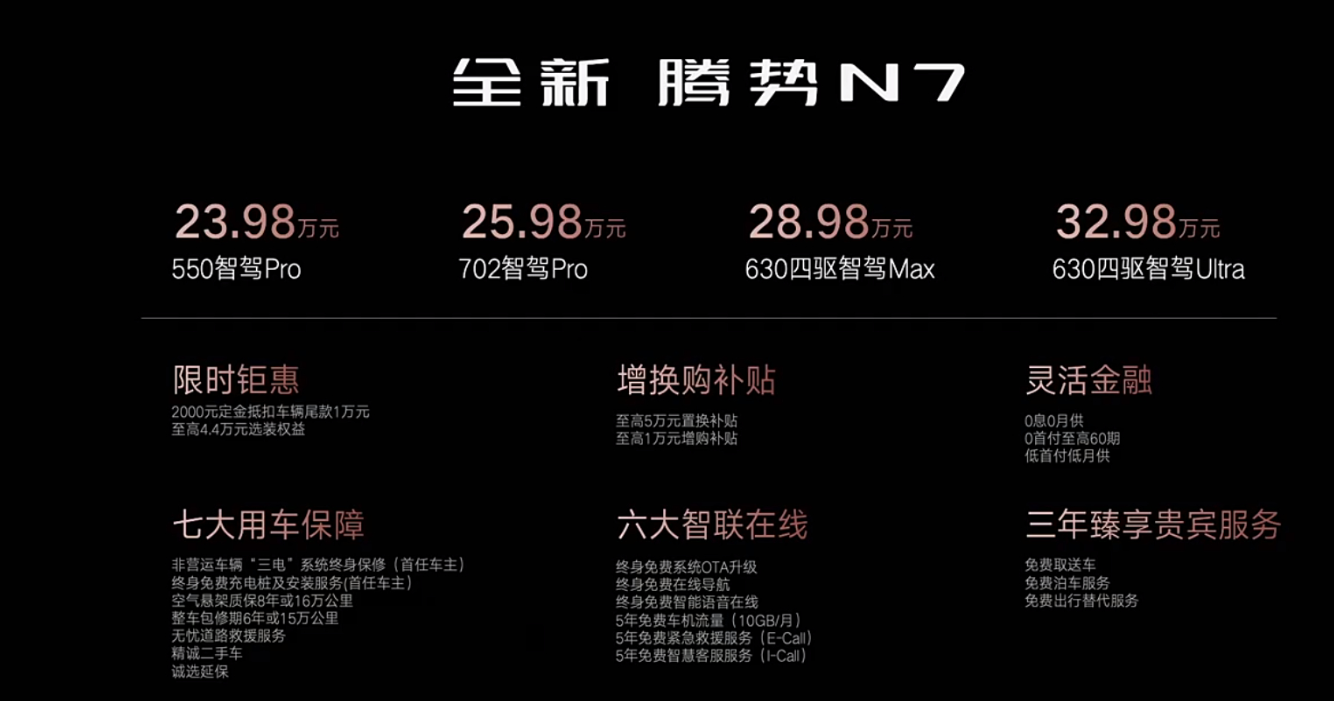 比亚迪旗下的高端豪华品牌腾势近期也有大动作,新款腾势N7发布,相比老款多加了一个550智驾Pro版,起售价来到了23.9万元,630四驱智驾Max、Ultra版和702智驾Pro版的价格也比上一代便宜了2万元左右,配置豪华依旧,身段却越放越低。