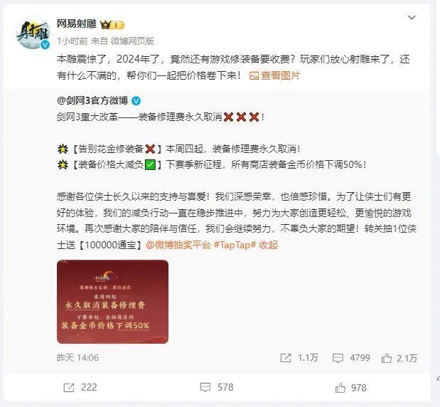 3月12日,西山居《剑网3》在官方微博宣布改革,要永久取消游戏内装备修理费。本来是讨好玩家的,但网易旗下的《射雕》官方微博转发阴阳“2024年了还有游戏修装备要收费”,表示要帮玩家把游戏价格“卷下来”。《剑网3》制作人余玉贤微博回应称,“便宜与否不是嘴上功夫”。