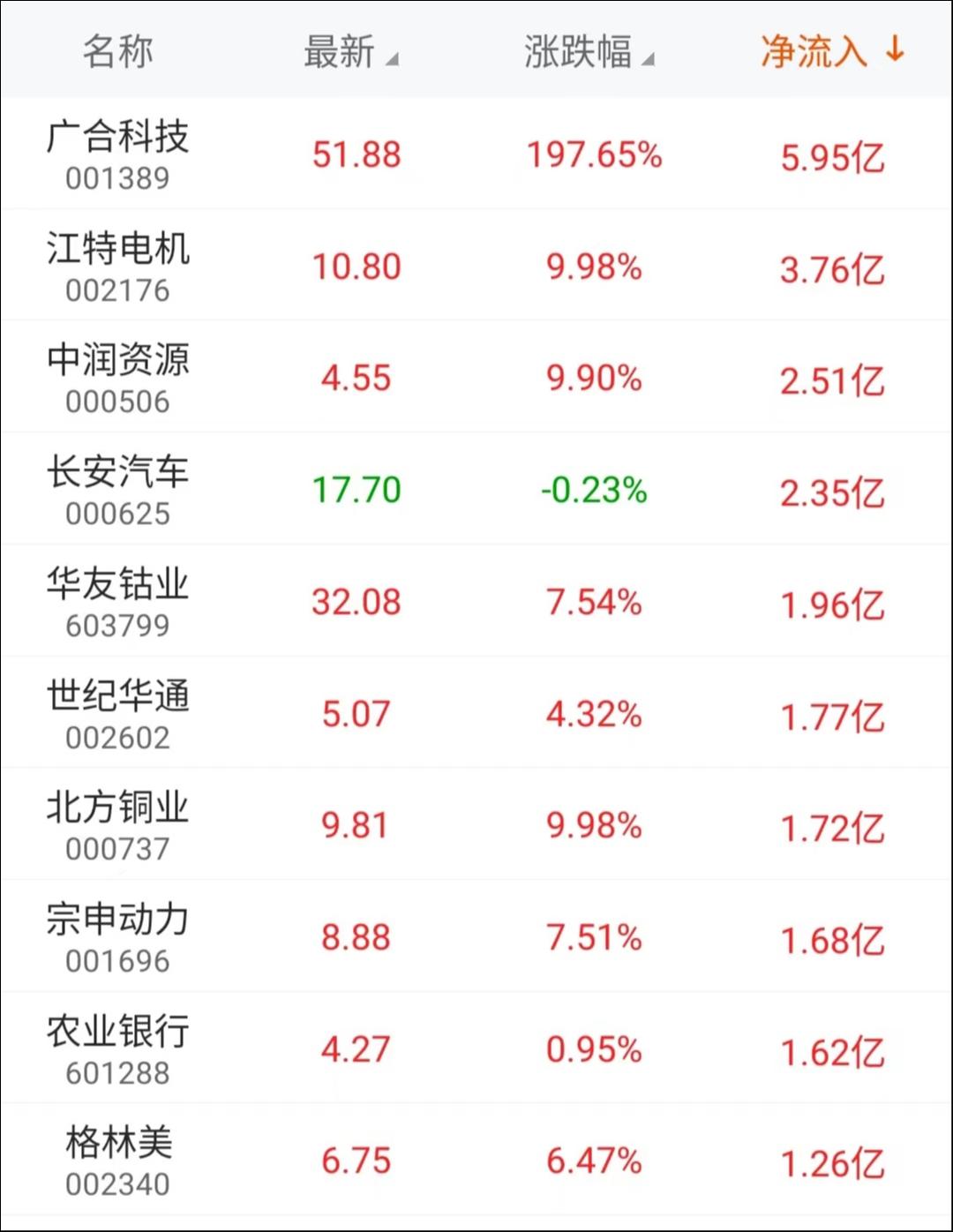 主力资金净流入最高的个股为广合科技,流入金额5.95亿元,其次是江特电机、中润资源和长安汽车,流入金额分别为3.76亿元、2.51亿元和2.35亿元。