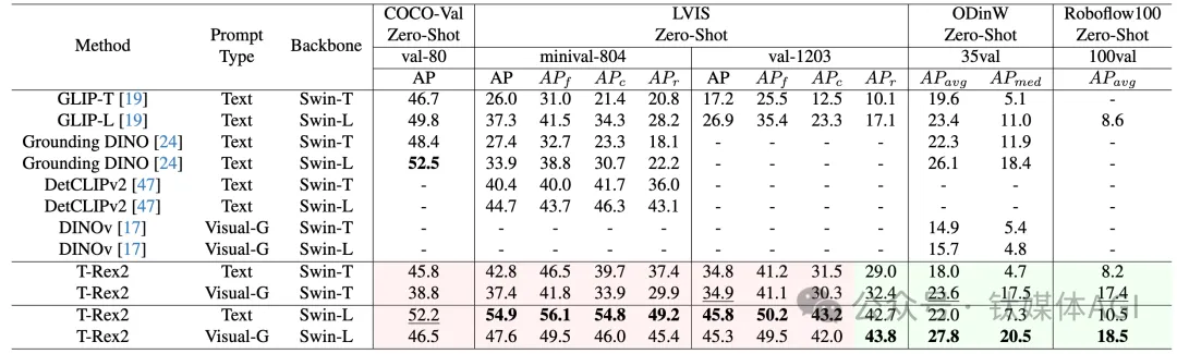 性能方面,T-Rex2 在四个学术基准测试集 COCO, LVIS, ODinW, 和Roboflow100 上取得了 Zero-Shot SOTA的性能。从指标上来看,文本提示和视觉提示分别在不同的场景下表现优异。
