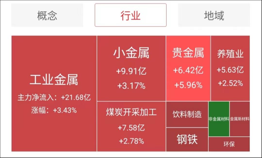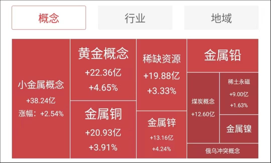 主力资金净流入最多的行业板块是工业金属、小金属、煤炭开采加工,流入最多的概念板块是小金属概念、黄金概念、金属铜、稀缺资源、金属锌、金属铅、煤炭概念板块。