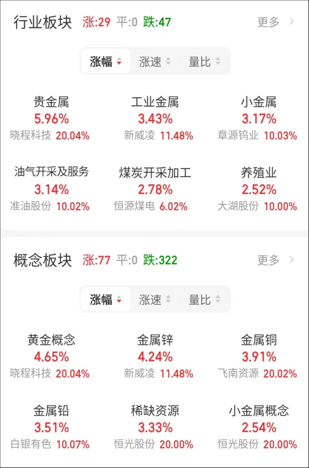 今日领涨的行业板块是贵金属、工业金属、小金属、油气开采及服务板块,领涨的概念板块是黄金概念、金属锌、金属铜、金属铅、稀缺资源。