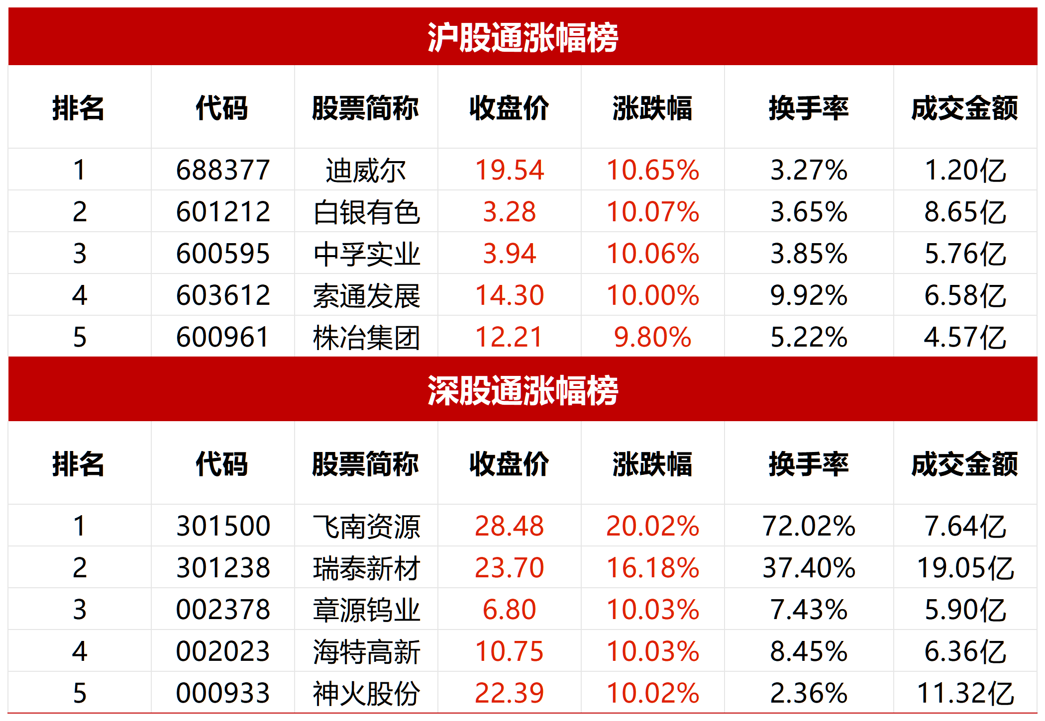 沪股通、深股通涨幅前五个股如下。