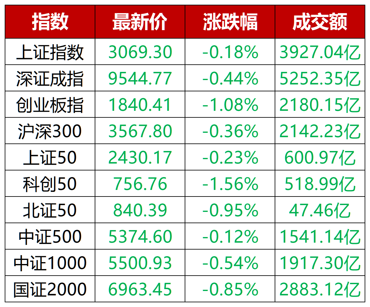 今日三大指数集体收跌,回踩5日线寻找支撑,中小题材板块跌幅较大,创业板跌超1%。