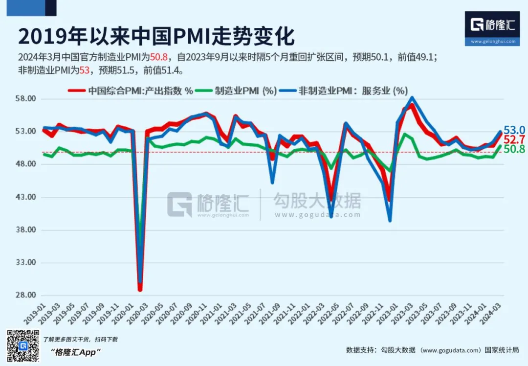 3月非制造业PMI为53%,高于预期的51.5%和前值的51.4%,连续第4个月上升。其中,服务业为52.4%,环比回升1.4%,建筑业为56.2%,环比回升2.7%。整体来看,3月制造业外需有不错改善,且内需不差且呈改善之势,是今日A股市场强势大涨的重要逻辑。