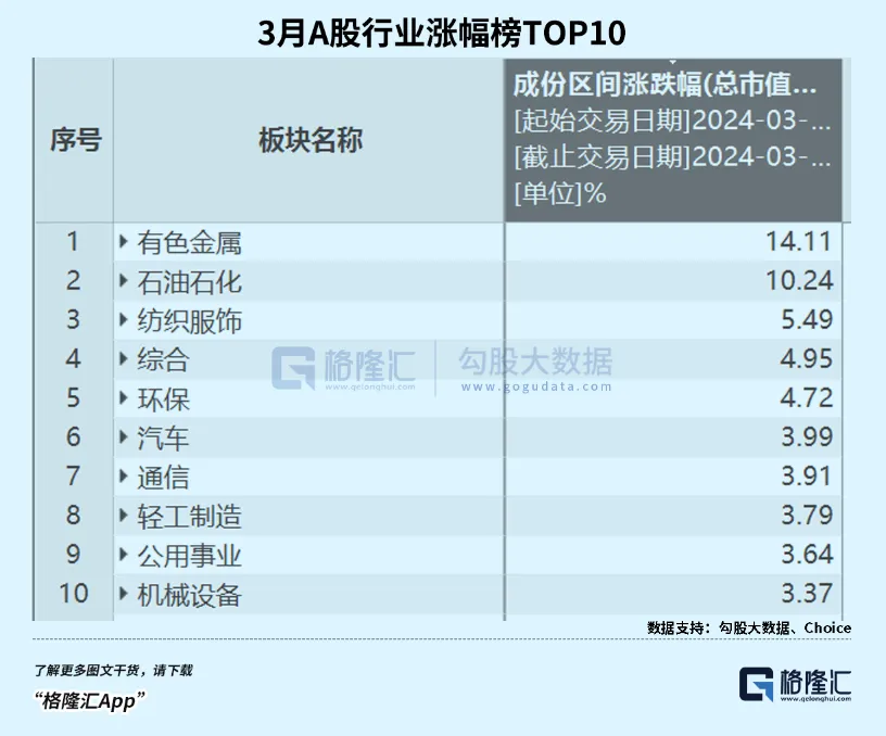 行业板块分化较为明显。其中,有色金属大涨14.11%,石油石化大涨10.24%,纺织服饰、环保、汽车、国防军工等涨幅也都不错。然而,非银金融、煤炭、医药生物、银行则录得不小跌幅。
