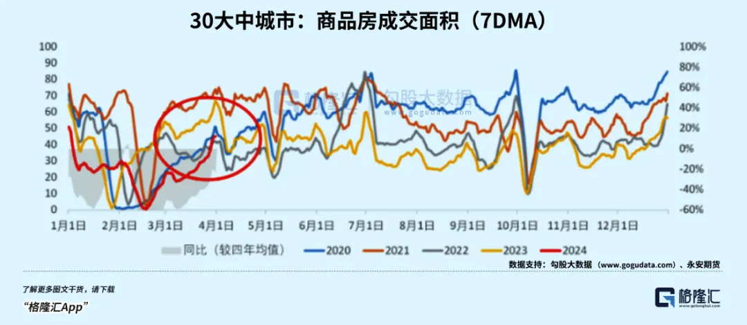 从高频数据看,房地产市场销售在近期也有回暖。截止3月28日,30大中城市商品房月均成交面积农历同比上行5.7%至-41.4%。拆分看,一线、二线、三线城市分别上行8.1%、6.4%、2.3%。