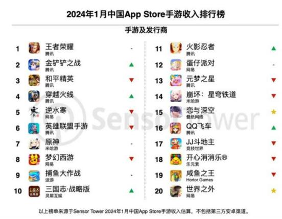 自去年下半年起,《原神》的收入、活跃玩家数开始呈现下滑趋势,自Sensor Tower发布的2024年1月中国App Store手游收入排行榜看,《原神》排行第七,早已没了与《王者荣耀》一掰手腕的势头。
