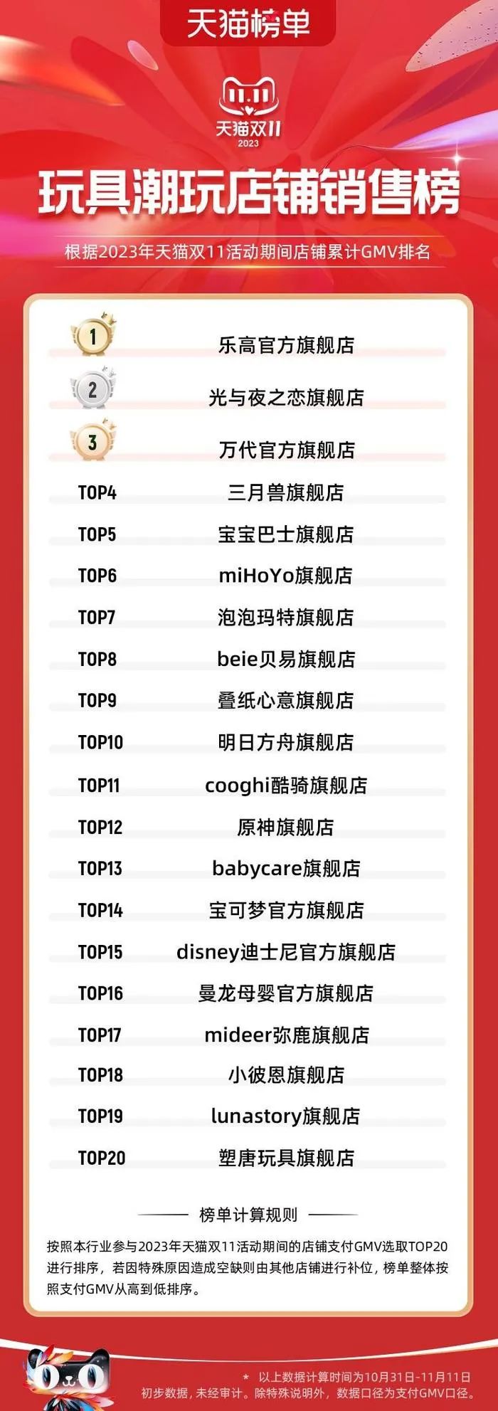 同时,2023年双十一活动期间,玩具潮玩店铺累计GMVTOP20榜单中,光与夜之恋旗舰店、miHoYo旗舰店、叠纸心意旗舰店、明日方舟旗舰店、原神旗舰店皆上榜,其中光与夜之恋旗舰店排名第二,GMV仅次于乐高旗舰店,这也证明了二次元内容向游戏周边生意的高额想象空间。