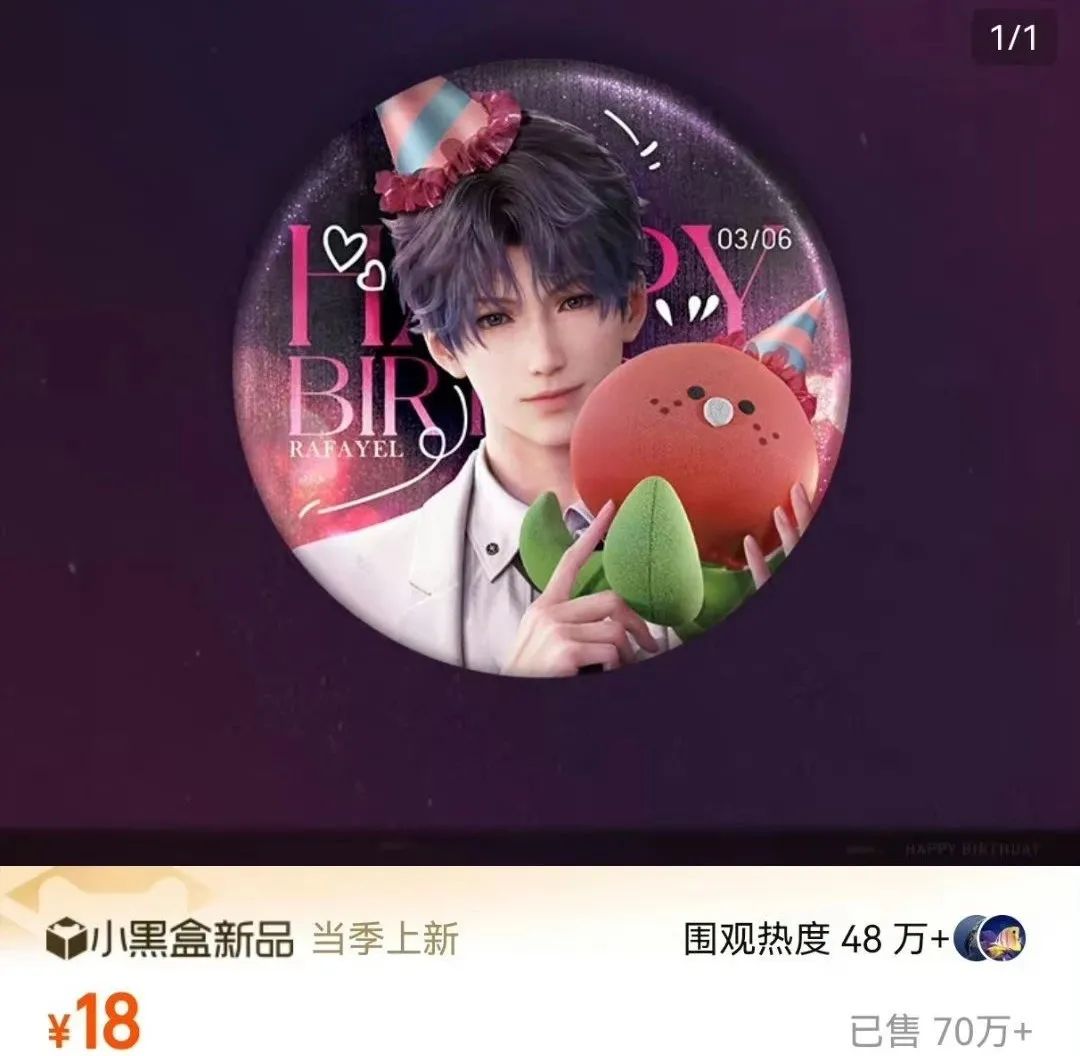 乙女游戏《恋与深空》在叠纸心意旗舰店上线首批周边后,15款周边产品2小时内销售额破4000万,截至首批周边下架,销量最高的“祁煜生日马口铁徽章”销量超70万,以18元的单价计算,仅是这一款周边销售额便达到1260万。此外,首批周边中生日纪念胶片、生日灯光画、生日合影挂件等商品销量都是10万起步。