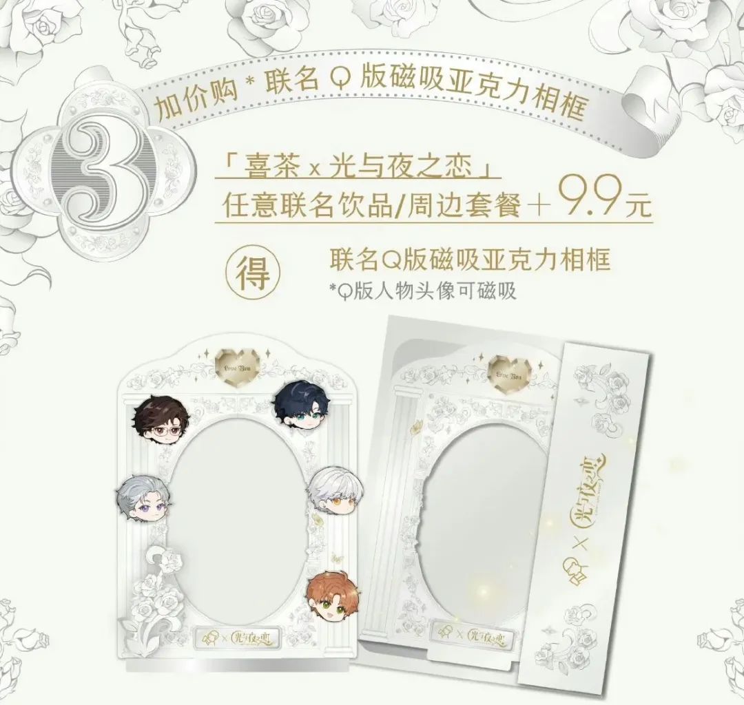 除了游戏官方通贩的周边,近一两年二次元内容向游戏的联名周边也非常火爆,比如近期新茶饮品牌喜茶在与乙女游戏《光与夜之恋》的联动中,便推出了男主联名透卡、磁吸亚克力相框等周边,其中磁吸亚克力相框加购价为9.9元,以14万份的数量计算,这一款周边创造的营收近140万。