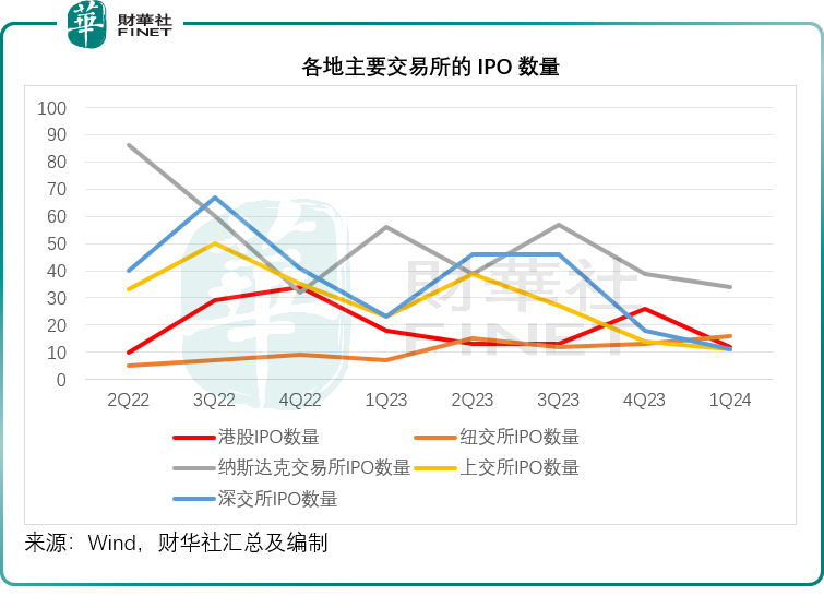 二级市场的表现也影响到新股和再融资市场,今年第1季,纽交所和纳斯达克交易所的IPO数量分别为16家和34家,高于港股的12家和上交所及深交所的各11家,A股IPO步伐放缓或与监管有关,而港股的IPO活动或与市场表现有关。
