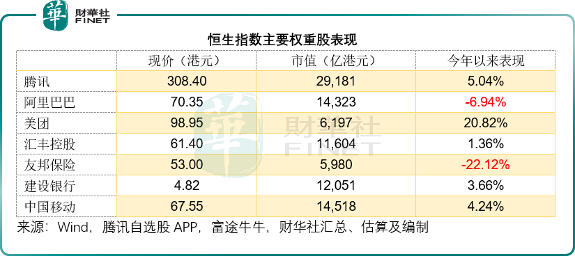 值得留意的是,尽管整体股指向下,恒生指数的主要权重股仍普遍向上,见下表,腾讯(00700.HK)今年以来累计上涨5.04%,美团(03690.HK)更大涨20.82%,但是权重达8%的阿里巴巴(09988.HK)和权重达7%的友邦保险(01299.HK)却分别累跌6.94%和22.12%,或是拖累指数表现的主要原因。