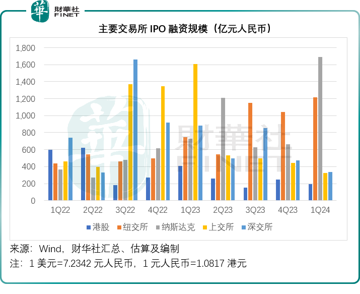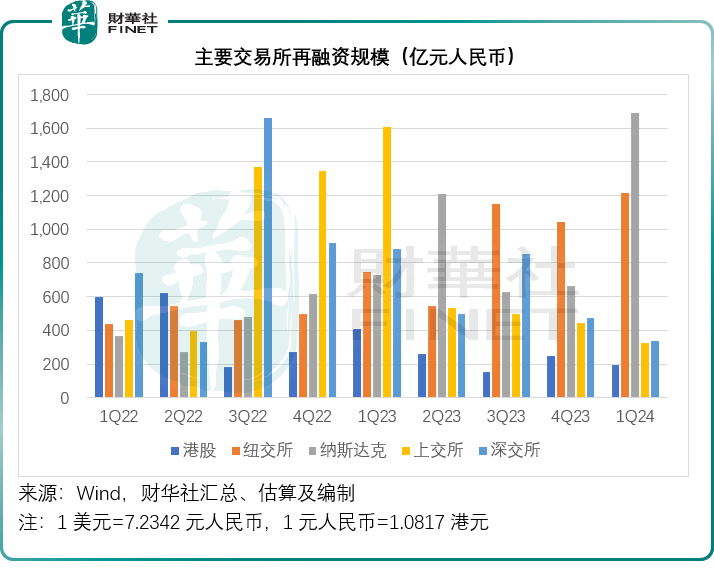 上市后融资方面,纽交所和纳斯达克交易所的再融资规模分别为168亿美元(约合1215亿元人民币)和234亿美元(约合1,692亿元人民币),远高于港股市场的210.19亿港元(约合194亿元人民币)和A股沪深两市合共664亿元人民币。