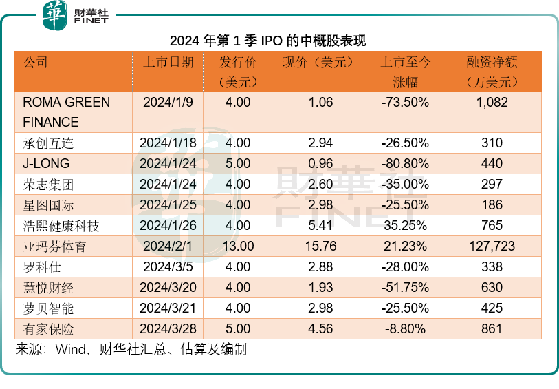 这11家于2024年第1季IPO的中概股中,除了浩熙健康科技(HAO.US)和亚玛芬体育上涨外,其他上市后均跳水,见下表。