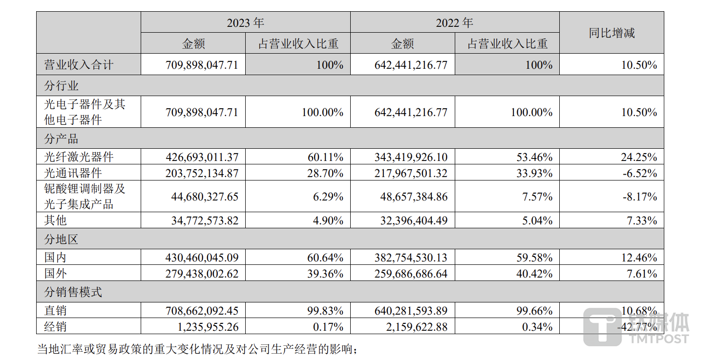 细分产品来看,光库科技营收主力军光纤激光器件在2023年实现收入4.27亿元,同比增加了24.25%。不过,光通讯器件、铌酸锂调制器及光子集成产品的收入均出现下滑,上述两个产品收入分别为2.04亿元、4468.03万元,分别同比下降6.52%、8.17%。 ![]()