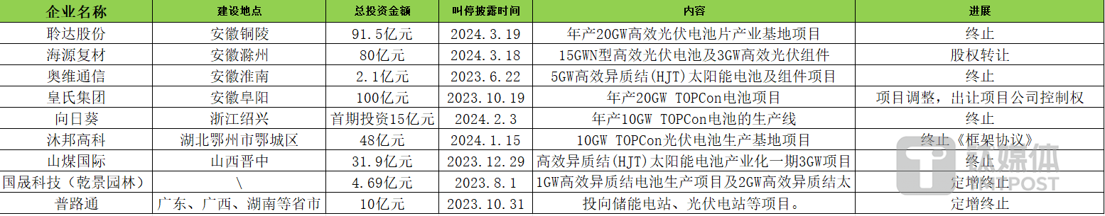 以聆达股份为例,在铜陵项目终止前,聆达股份已公布了对子公司金寨嘉悦高效光伏太阳能电池片生产线实施临时停产的消息,停产时间至2024年4月15日。据悉,金寨嘉悦计划总投资约40亿元,规划建设10GW高效光伏电池产能,项目分三期建设,一期已建成投产3.5GW高效PERC晶硅电池项目;二期投资建设5GW TOPCon电池智能工厂;三期将根据市场情况和公司实际发展战略进行规划。目前二期TOPCon项目还未有实质性进展信息披露。