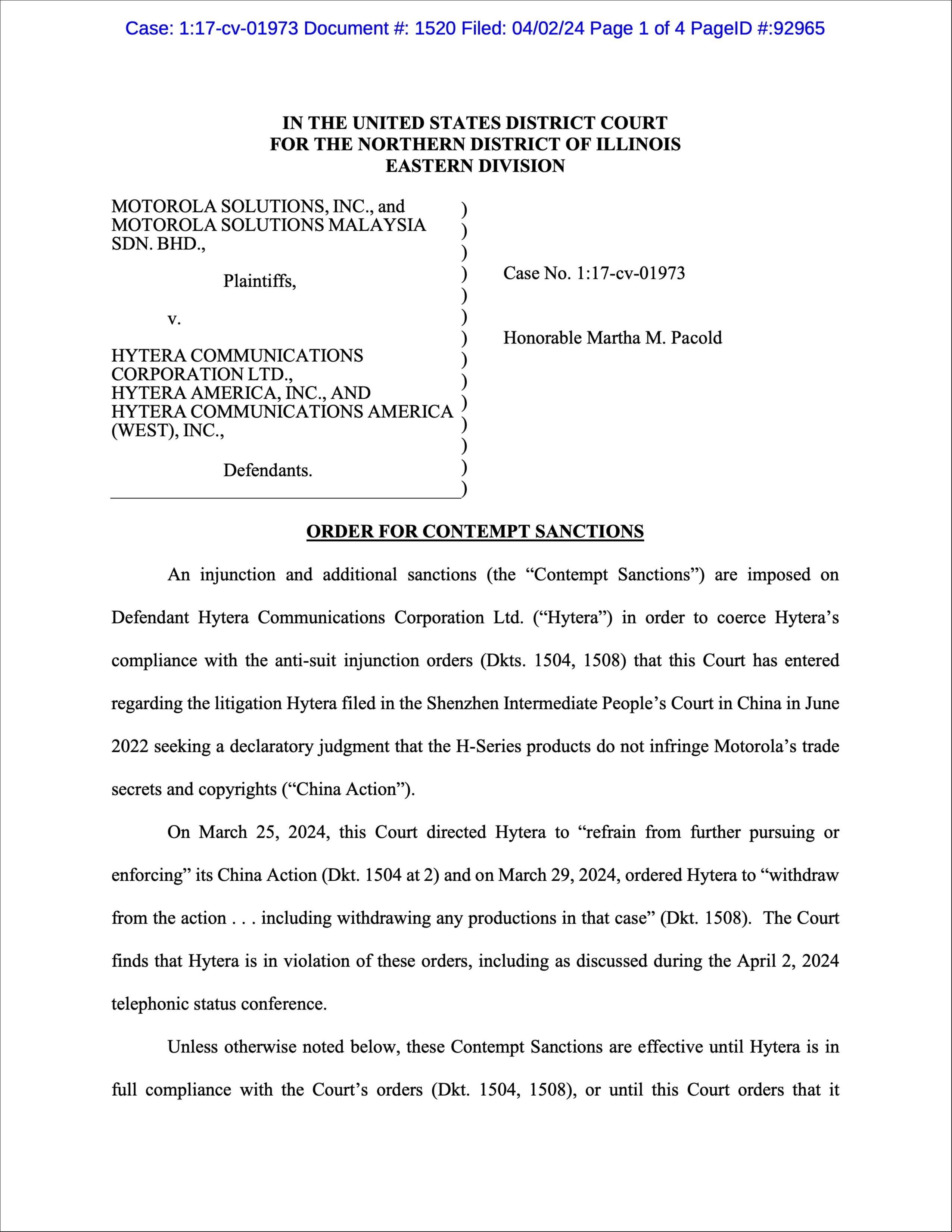 三、禁止依赖中国诉讼中的任何命令或判决:海能达被命令在中国诉讼中关于H系列产品的藐视程序结束之前,不得执行或依赖深圳法院在中国诉讼中发布的任何命令或判决。此命令于2024年4月2日发布。法官为Martha M. Pacold。