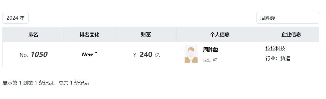 榜单显示,周胜馥今年以240亿元的财富位列总榜第1050名的位次。而助推周胜馥首次等上《胡润全球富豪榜》榜单的“功臣”,正是其一手创办的货运公司——拉拉科技。相比拉拉科技这个名字,外界对该公司所打造的货运平台货拉拉更为熟悉。