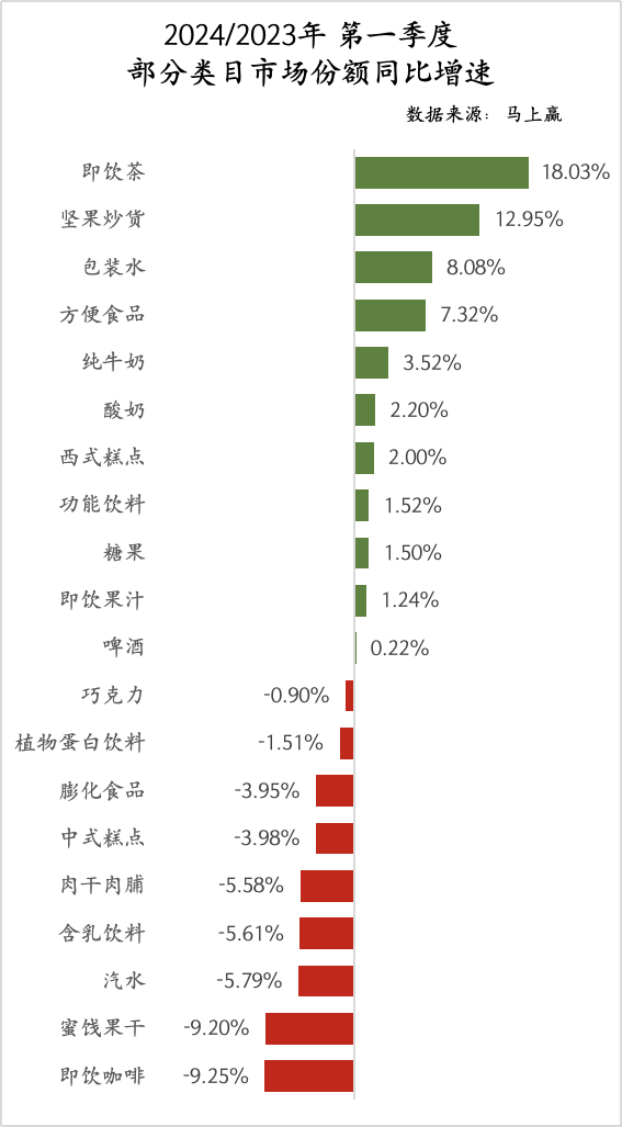 基于上述类目在对应大类中的份额同比可以看到,即饮茶、坚果、包装水、方便食品在2024Q1有较明显的同比增长,相对应的蜜饯果干、即饮咖啡、汽水、含乳饮料、肉干肉脯几个类目则有较明显的同比下滑,其余类目的同比份额变动均在±3%左右,变化不大。