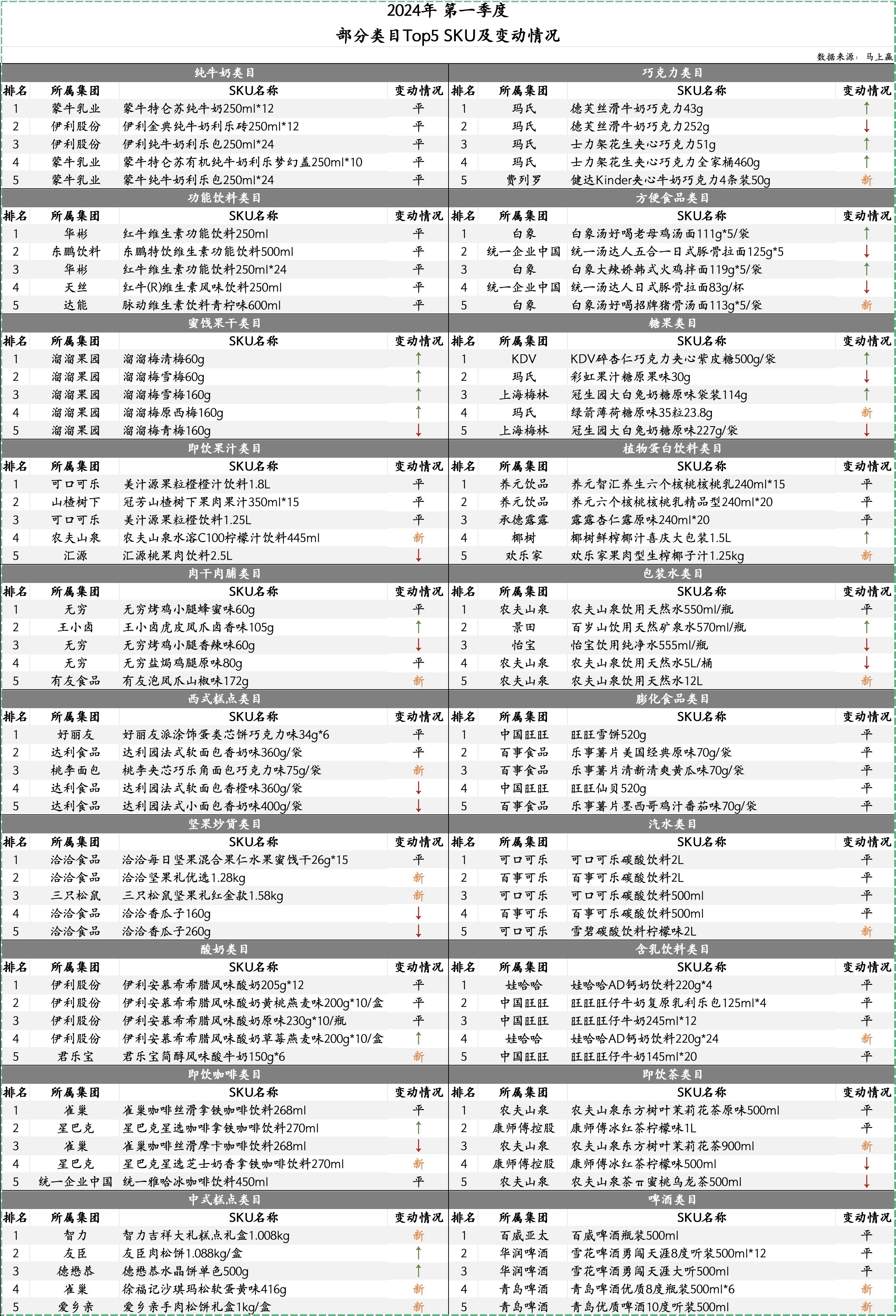 通过表格可以看到,纯牛奶、功能饮料、膨化食品三个类目的TOP 5 SKU及排序在23Q1、24Q1完全一致;汽水、含乳饮料、即饮果汁、植物蛋白饮料变动较小,仅有第四、第五名有新上榜或变动;新进入TOP 5 SKU产品较多的是中式糕点、坚果炒货、啤酒三个类目,分别有两三个产品汰换其他产品挤进季度类目TOP 5 SKU清单;前五SKU排序变化较大的类目有巧克力、方便食品、蜜饯果干、糖果、包装水,虽然TOP SKU商品池变化不大,但排名各有涨跌;其余类目则新上榜、上下调整兼有; 在典型类目的季度新品上,情况相比较为严峻,该部分中对于类目中“新品”的定义为在该季度首次登录在马上赢线下零售监测网络中的新商品信息及条形码;可以看到,24Q1所有类目的上市新品数量相比23Q1均有较显著的下滑,其中即饮果汁下滑最多,24Q1的新品只有23Q1新品数量的零头。其后包括啤酒、肉干肉脯、汽水、含乳饮料、糖果等类目也均有较大幅度的新品上市数量下跌。相比来说,纯牛奶、即饮茶、巧克力、包装水、即饮咖啡、坚果炒货的新品上市数量下滑较小。
