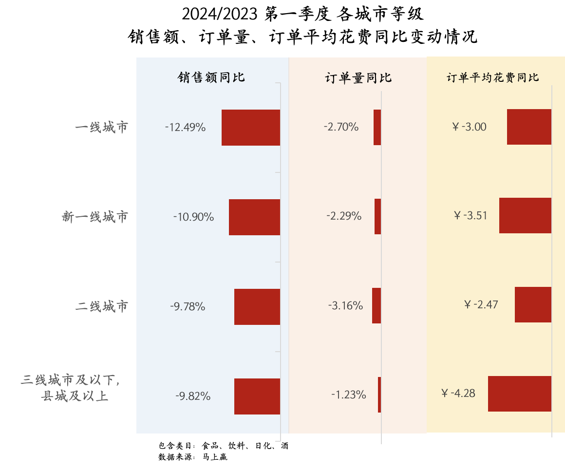 在「场」这一部分,我们回到食品、饮料、酒、日化的大类目中,通过对大类集合下各业态、各城市等级的同比情况表现去进行观察。首先是分业态的情况,马上赢线下零售监测网络基于大卖场、大超市、小超市、便利店、食杂店五大业态进行数据收集与分析,我们也拉取了这五大线下零售典型业态在本季度与同比上一季度在销售额、订单量与订单平均花费的情况。在销售额、订单量与订单平均花费三个方面,可以看到,各个业态24Q1的销售额同比23Q1均有较明显的下滑,其中食杂店的销售额下滑最为严重,订单量也有较明显的下滑。相对来说,其余四个业态虽然在销售额上也都有明显下滑,但在订单数量上则相对较为稳定,尤其是在去年集中爆出关店、亏损消息的大卖场、大超市等大业态,在订单数量同比上还有轻微的涨幅,可见大业态在过去一年中经历了充分的调整与“内卷”后,有一定的企稳迹象。