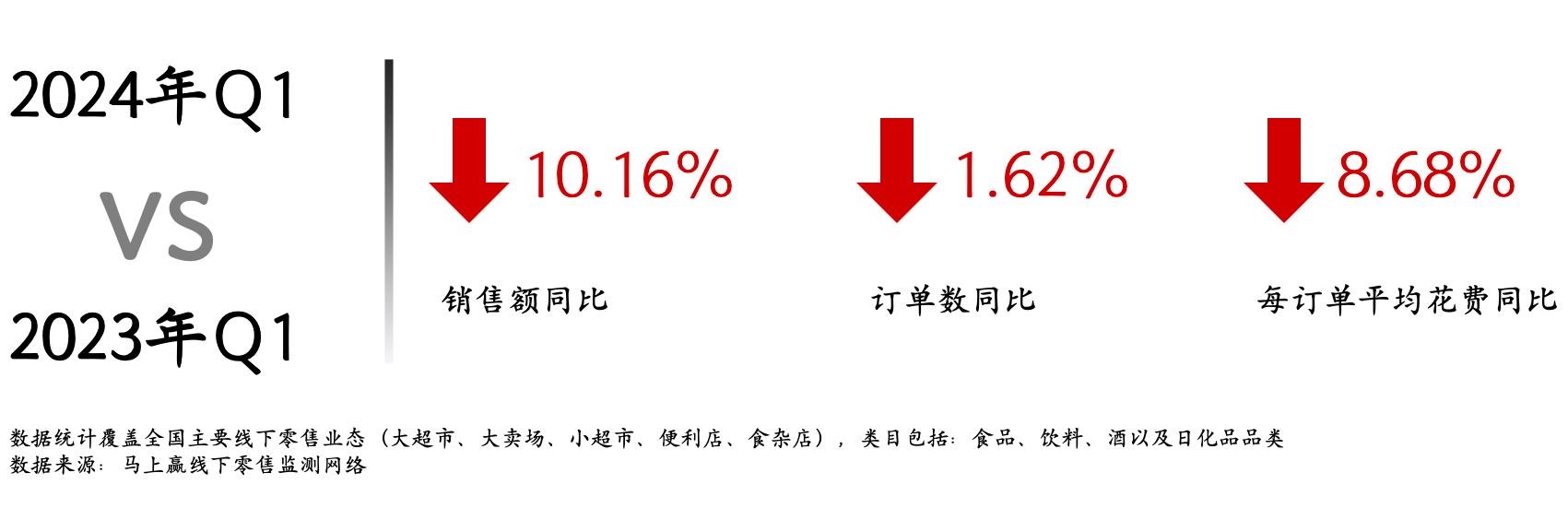 为了确保两个季度消费数据对比时样本池的一致性,本次使用的数据来源门店均为连续门店,即该门店在2024年4月前的15个月内均在马上赢线下零售监测网络中活跃。2023Q1与2024Q1门店样本池规模相同。