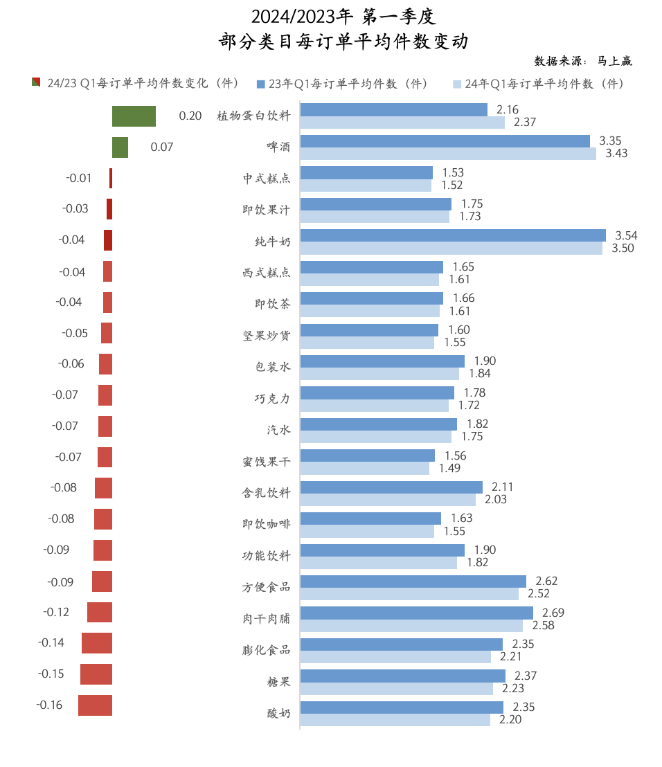 在每订单包含的类目商品件数上,可以看到纯牛奶、啤酒在所有类目中单订单平均购买件数最高,即便该两类目中大规格销售较为普遍,其单订单平均购买件数依然高于其他类目。第二梯队在零食与方便食品包括肉干肉脯、膨化食品、糖果等,以及酸奶与植物蛋白饮料,或许是由于零食消费较多聚会分享场景,单次购买量与购买种类均更多,酸奶与植物蛋白饮料则与啤酒、纯牛奶情况类似;23Q1与24Q1的同比变化整体波动不大,所有类目平均件数变动均在±0.2件之间,植物蛋白饮料、啤酒有轻微上涨,其他类目持平或轻微下滑。