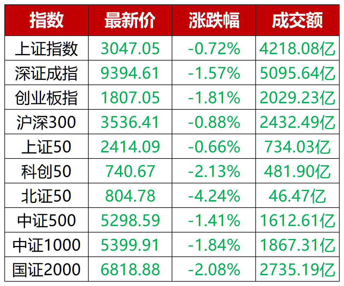 4月8日三大指数集体下跌,科创和中小市值跌幅较大,创业板跌1.81%,科创50指数跌超2%,北证50指数跌超4%,国证2000也跌超2%。